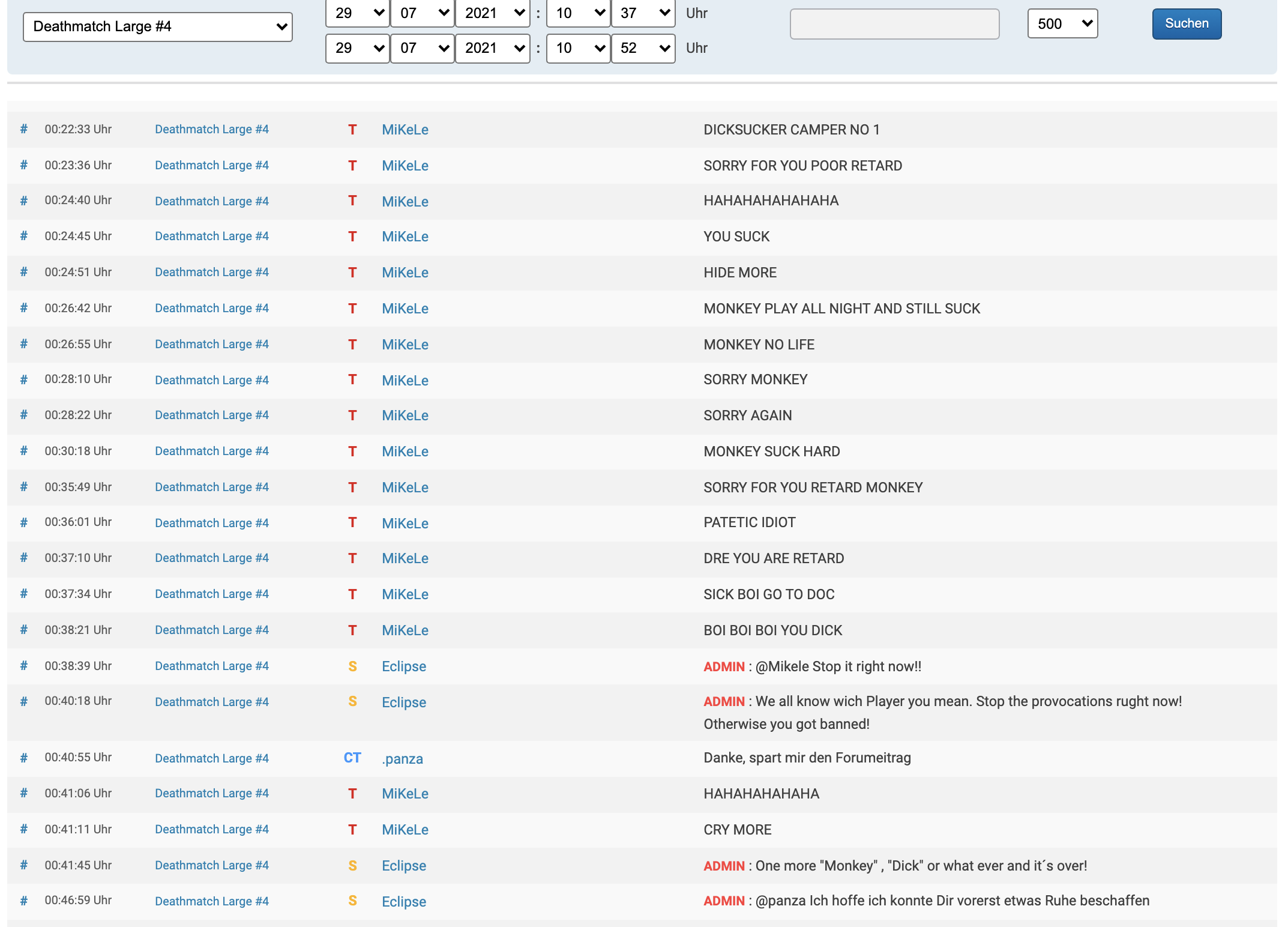 Da ich das mit den 24 Stunden durchaus verstanden habe, fasse ich lediglich zusammen, dass mich Spieler "MiKeLe" seit nun mehr 10 Wochen UNUNTERBROCHEN beleidigt, provoziert und noch schlimmer, (meiner Meinung nach) versteckt rassistisch angeht. Das hat eine Vorgeschichte vor vielen Wochen, die ich nicht beweisen kann. Auf irgendeinem anderen Server hatte er mich mal entdeckt und mir erstmals ein Gespräch aufgezwungen. Anfangs fand ich es ok, erzählte ihm auch, dass ich der sog. "Schwarzen Szene" (Black Scene übersetzt) angehöre. Das hat was mit Musik zu tun. Er interpretierte dies und kommentierte irgendwas mit "n***a", worauf ich ihn dort blockierte. Das war aber nicht auf C2play und somit gehört es EIGENTLICH nicht hierher.
