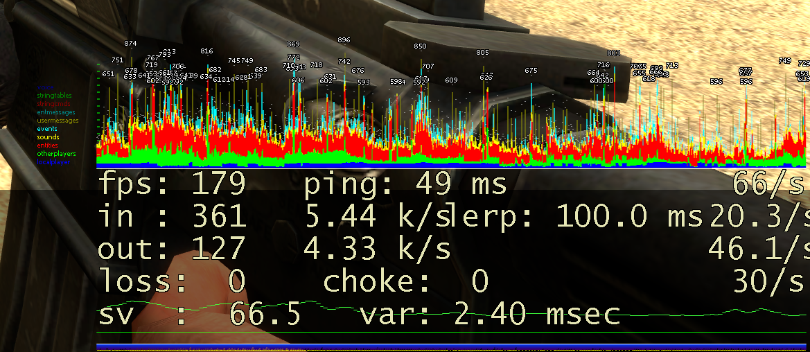 net_graph 4Achte auf choke in der vorletzten Zeile. Wenn dieser Wert höher als 0 ist, kann es sein, dass Deine Rate zu niedrig eingestellt ist. In unserem Test bei 40 Spielern ist eine Rate von 80.000 (78,3 KiB/s) ausreichend: